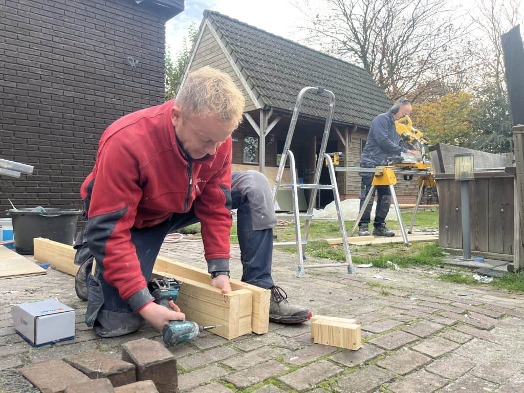 Voor dit project combineren we verschillende bouwvormen, waaronder elementen van ruwbouw en afbouw. Door slim gebruik te maken van duurzame materialen zorgen we ervoor dat de zitplek en berging niet alleen functioneel zijn, maar ook mooi passen in de landelijke omgeving.